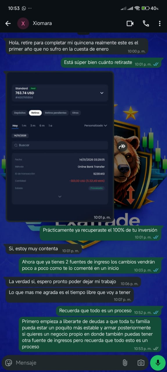 Empecé con poco conocimiento y capital moderado. El equipo de ExaTrade me guió desde el día uno, diseñando una estrategia que se ajustara a mi perfil. No me sentí como un número, sino como una cliente valorada. Hoy gestiono mi inversión con soltura y seguridad. ¡Gracias por hacer el trading accesible y transparente!